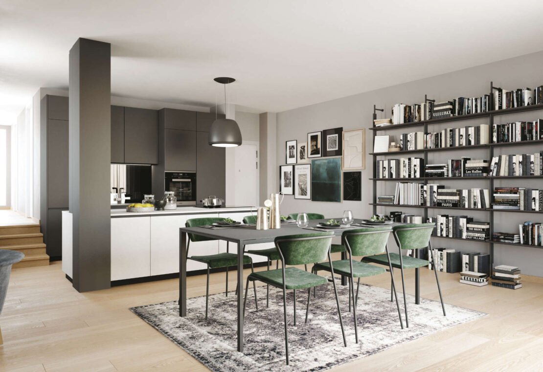 Dopo: cucina e living attorno al pilastro e spazi conviviali.