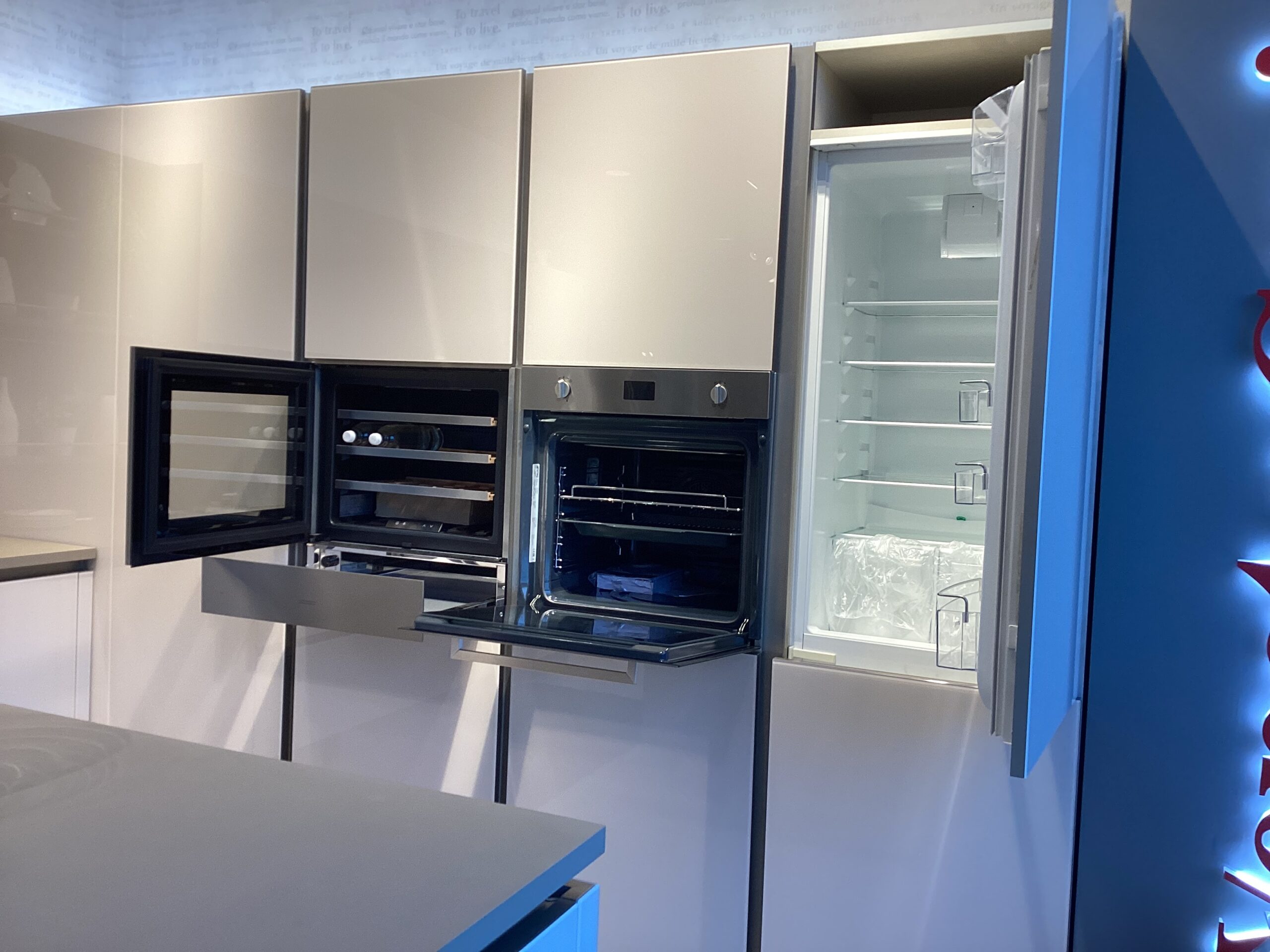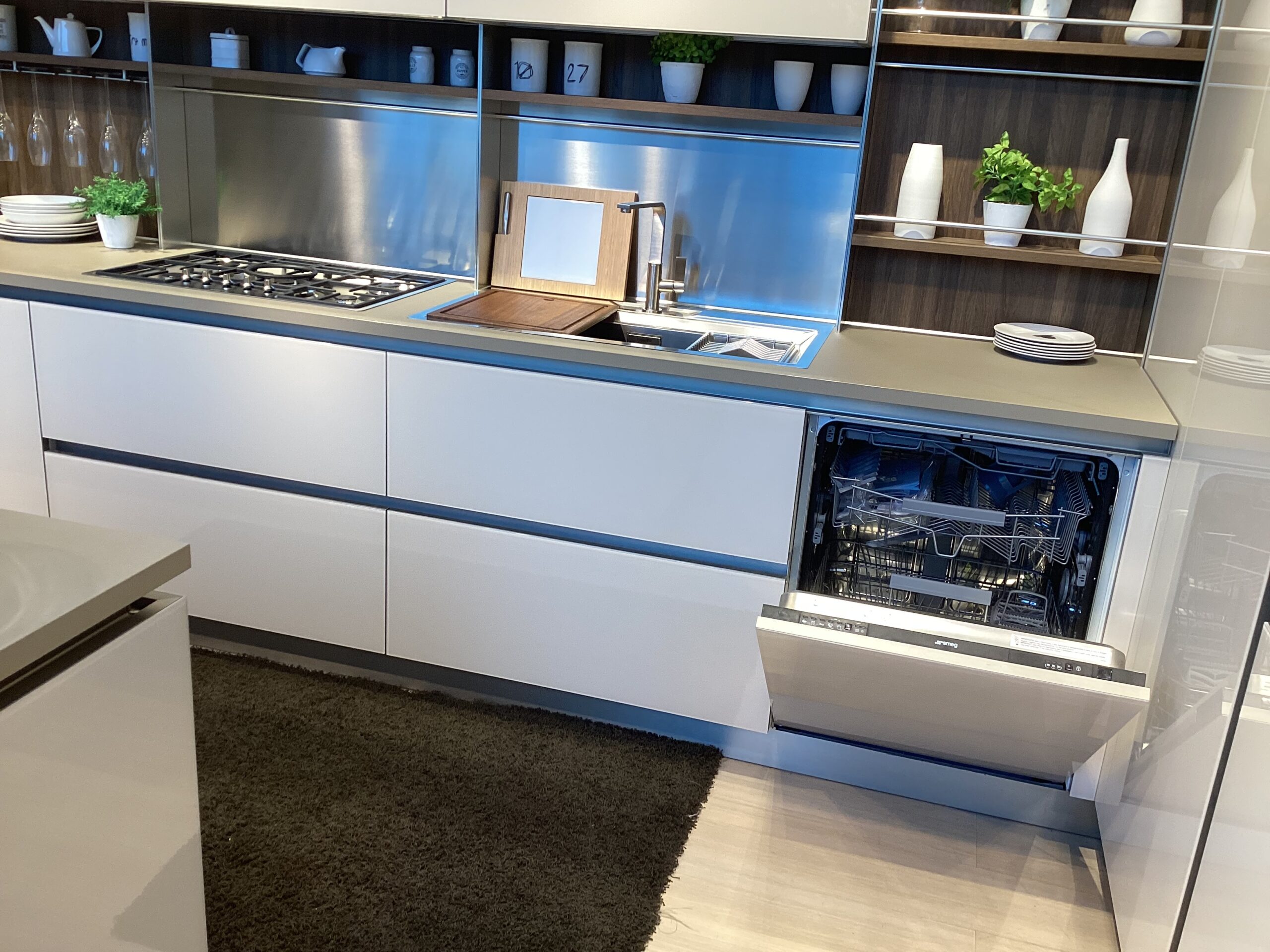 Frigo, forno, lavastoviglie e piano cottura 5 fuochi gas. lavello acciaio semifilo Foster Cantina vini Electrolux.
